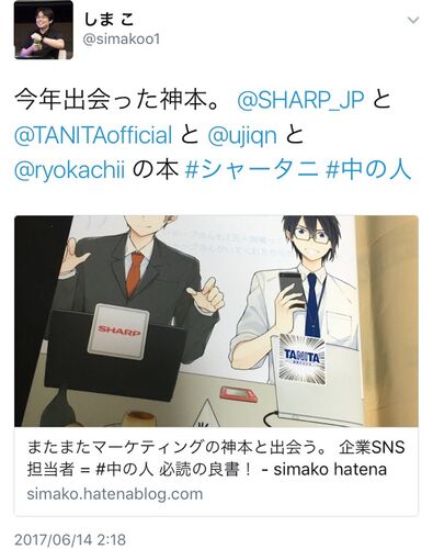 本日、こちらの投稿が、 シャープ公式さんや、セガ公式さんにRTされ、伸びました。 今年出会った神本。 @SHARP_JP と @TANITAofficial と @ujiqn と @ryokachii の本 #シャータニ #中の人 https://t.co/oODFE4MF7q — しま こ (@simakoo1) 2017年6月13日 その…